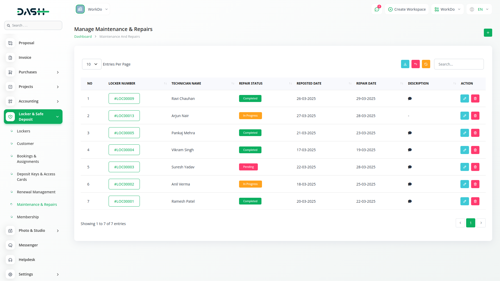 To ensure lockers remain in optimal condition, the system logs maintenance requests, technician details, and repair status. Each repair is documented with descriptions and timestamps, helping administrators track locker conditions efficiently.